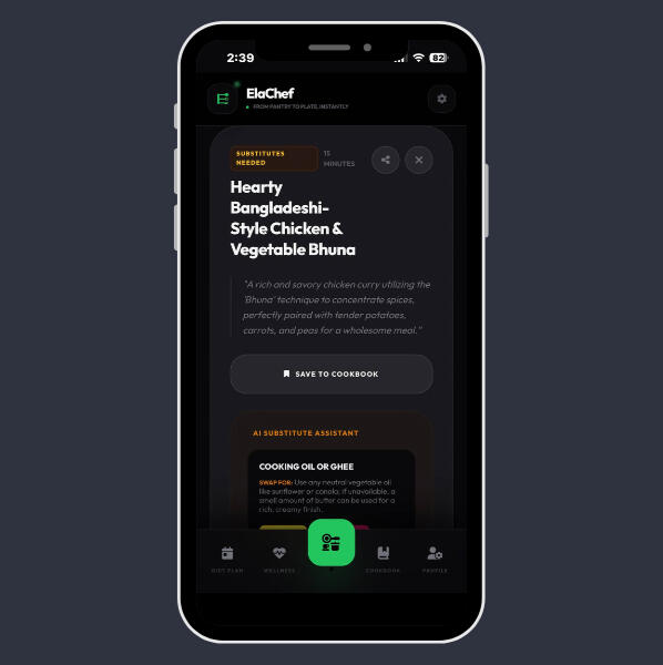 From ingredient-based recipes to nutrition-aware meal planning, ElaChef combines AI recognition, smart substitution logic, and personalized recommendations into one streamlined experience. It is designed for busy urban households, fitness-focused users, and anyone who wants to reduce food waste while eating better.